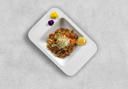 Kawałki marynowanej wołowiny smażone na woku z makaronem udon z dodatkiem marchewki, czerwonej papryki, grzybów shiitake, groszku strączkowego i kukurydzy z sosem sweet chilli. Danie posypane prażonym sezamem i orzechami nerkowca.