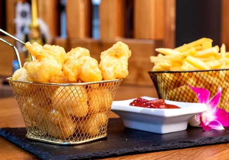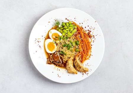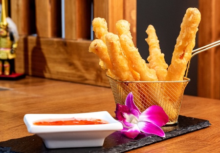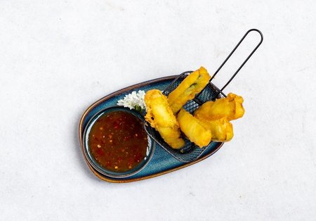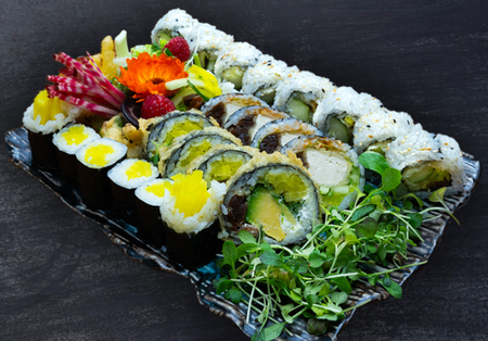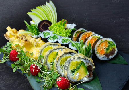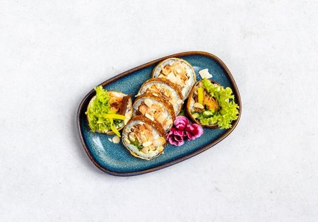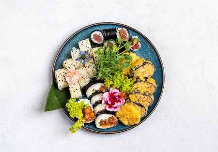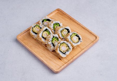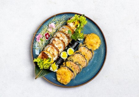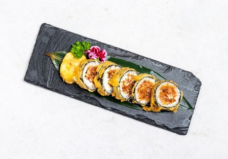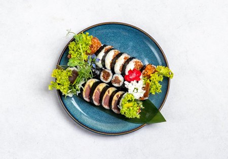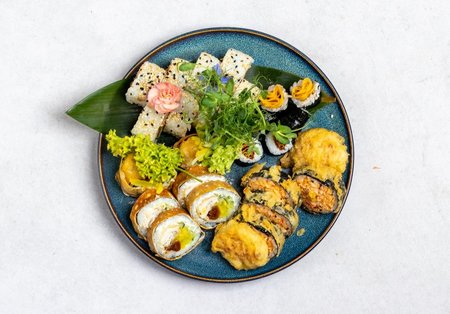 26 szt. 6x tempura z awokado, serkiem Philadelphia i warzywami, 6x futomaki z tofu w tempurze, spicy mayo i warzywami, 8x California maki z cukinią w tempurze, spicy mayo i warzywami, 6x hosomaki z marynowaną rzepą