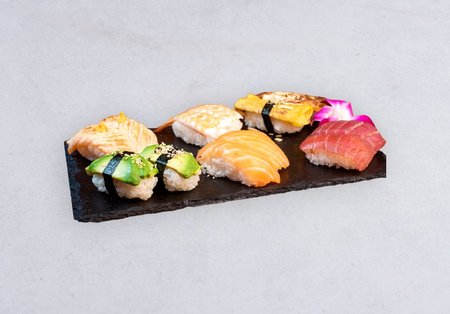 12 szt. 2x nigiri z łososiem, 2x nigiri z opalonym łososiem, 2x nigiri z tuńczykiem, 2x nigiri z krewetką, 2x nigiri z omletem tamago, 2x nigiri z awokado