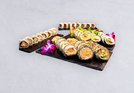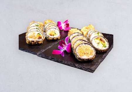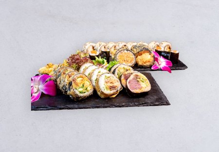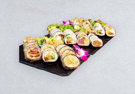 38 szt. 6x tempura maki z sałatką surimi, 6x tempura maki z cukinią w tempurze, spicy mayo i warzywami, 6x tamago maki z grillowanym łososiem, serkiem Philadelphia i warzywami, 6x futomaki z tuńczykiem, spicy mayo i warzywami, 8x California maki z dorszem w tempurze, serkiem Philadelphia i warzywami, 6x hosomaki z łososiem