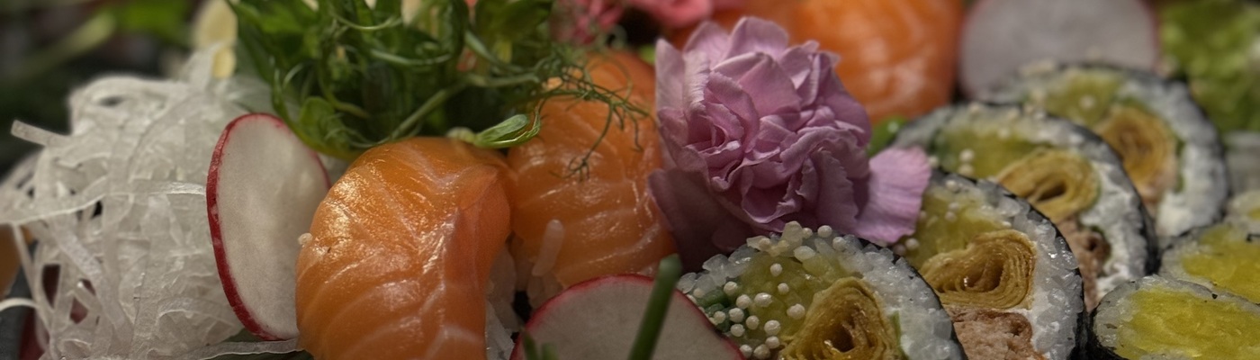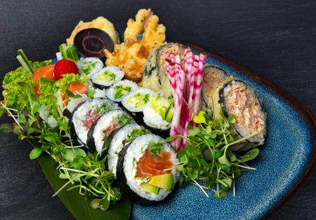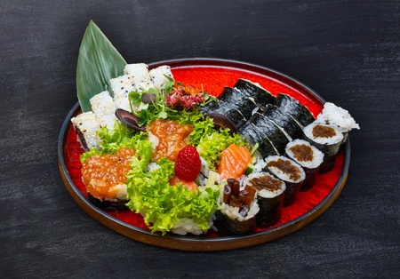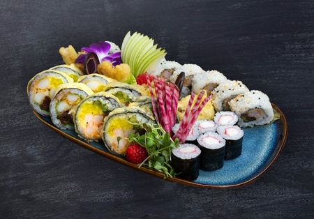 26 szt. 6x tempura maki z sałatką surimi, 6x futomaki z tatarem z łososia, serkiem Philadelphia, 8x California z grillowanym łososiem, serkiem Philadelphia i warzywami, 6x hosomaki z tuńczykiem