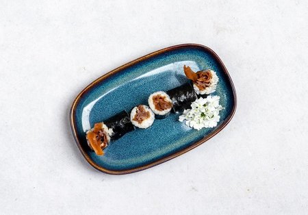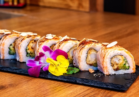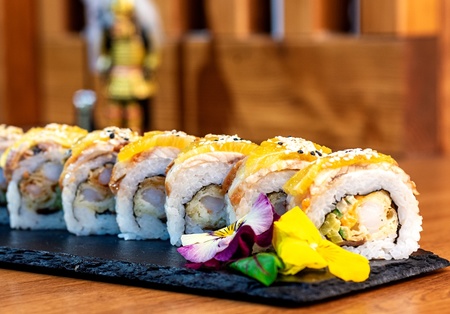 Rolka z krewetką w tempurze spicy mayo i warzywami owinięta marynowanym węgorzem