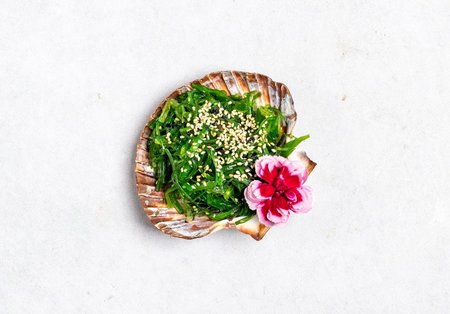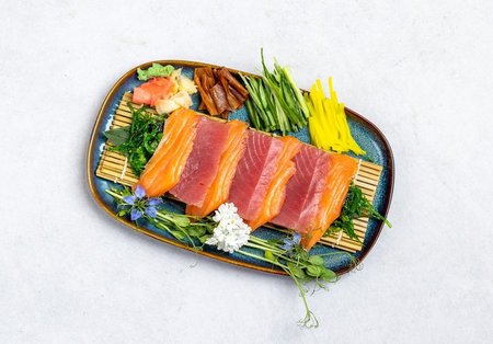 7 Plastrów surowej ryby w towarzystwie warzyw i sałatki goma wakame. Zdjęcie poglądowe
