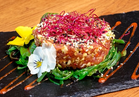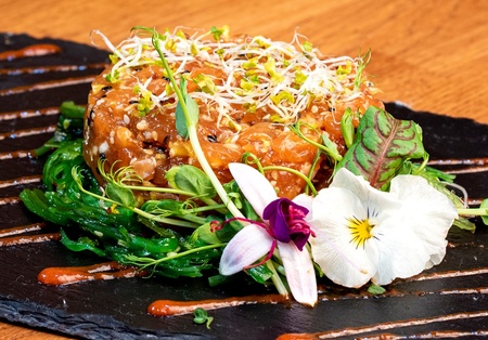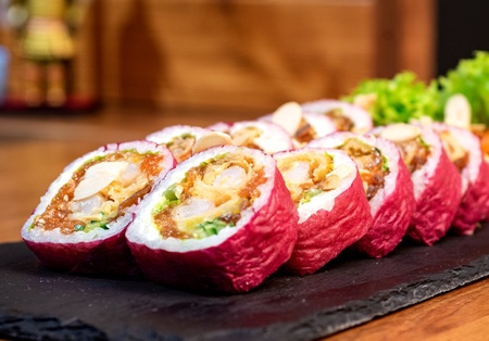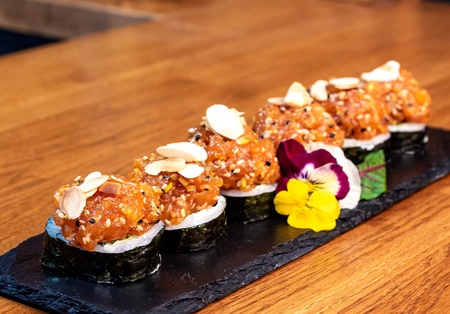 Rolka z tatarem z łososia krewetkami w tempurze spicy mayo i warzywami zawinięta w papier sojowy.