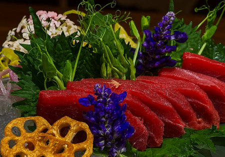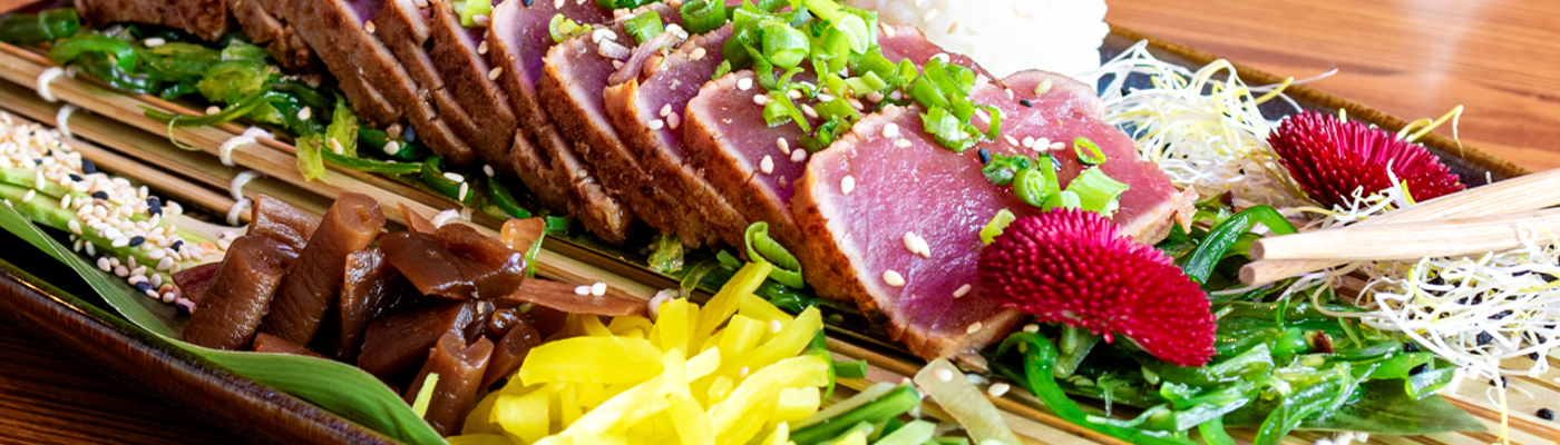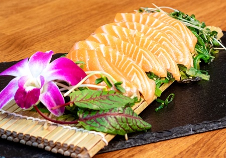 7 Plastrów surowej ryby w towarzystwie warzyw i sałatki goma wakame