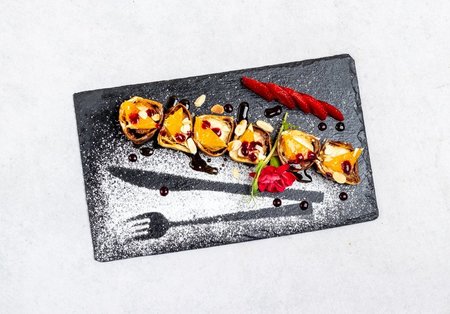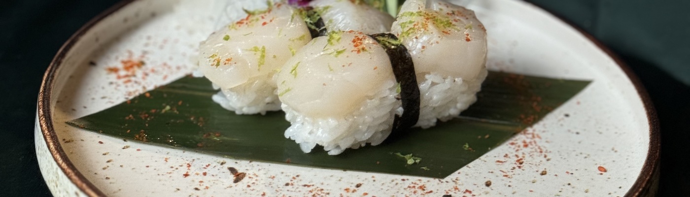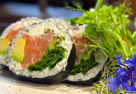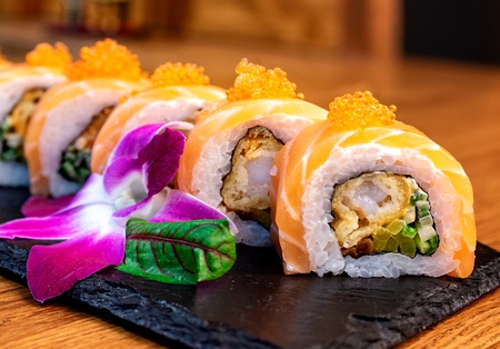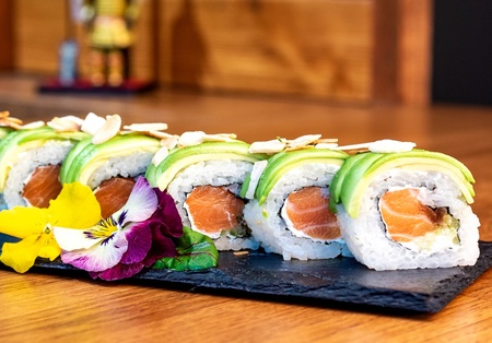 Rolka z krewetką w tempurze spicy mayo i warzywami owinięta opalonym łososiem w towarzystwie whisky i cukru trzcinowego.