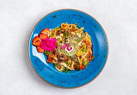 Kawałki tofu smażonego na woku z makaronem udon z dodatkiem marchewki, czerwonej papryki, grzybów shiitake, groszku i kukurydzy z sosem sweet chilli. Danie posypane prażonym sezamem i orzechami nerkowca. Zdjęcie poglądowe