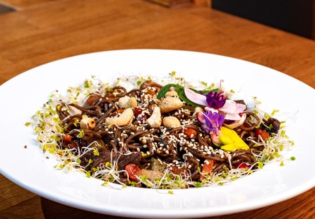 Kawałki marynowanej wołowiny smażone na woku z makaronem gryczanym z dodatkiem marchewki, czerwonej papryki, grzybów shiitake, groszku strączkowego i kukurydzy z sosem sweet chilli. Danie posypane prażonym sezamem i orzechami nerkowca. Zdjęcie poglądowe