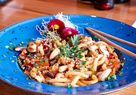 Kawałki fileta drobiowego smażonego na woku z makaronem udon z dodatkiem marchewki, czerwonej papryki, grzybów shiitake, groszku strączkowego i kukurydzy z sosem sweet chilli. Danie posypane prażonym sezamem i orzechami nerkowca. Zdjęcie poglądowe
