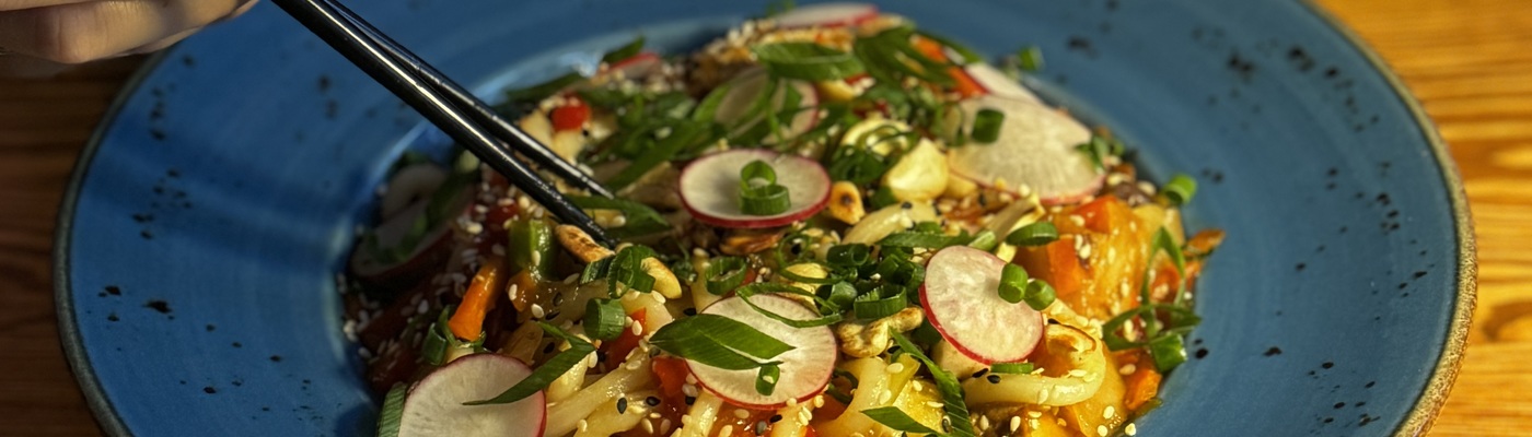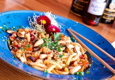 Kawałki marynowanej wołowiny smażone na woku z makaronem udon z dodatkiem marchewki, czerwonej papryki, grzybów shiitake, groszku strączkowego i kukurydzy z sosem sweet chilli. Danie posypane prażonym sezamem i orzechami nerkowca.