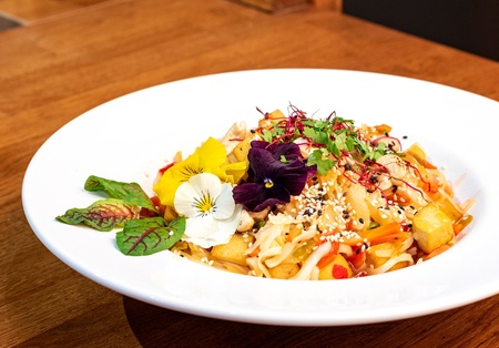 Kawałki tofu smażonego na woku z makaronem ryżowym z dodatkiem marchewki, czerwonej papryki, grzybów shiitake, groszku i kukurydzy z sosem sweet chilli. Danie posypane prażonym sezamem i orzechami nerkowca. Zdjęcie poglądowe