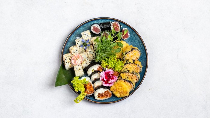 6x futomaki z tatarem z łososia, serkiem Philadelphia, 8x California z grillowanym łososiem, serkiem Philadelphia i warzywami,