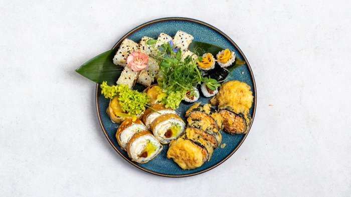 6x tempura z sałatką surimi tamago z dorszem w tempurze, serkiem Philadelphia i warzywami,