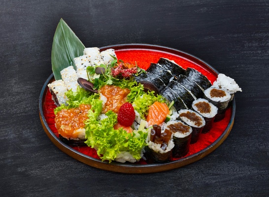 6x futomaki z tatarem z łososia, serkiem Philadelphia, 8x California maki z tuńczykiem spicy mayo i warzywami,