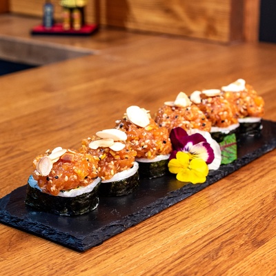 Rolka z grillowanym łososiem serkiem Philadelphia i warzywami podawana z czapeczką tatara z łososia.