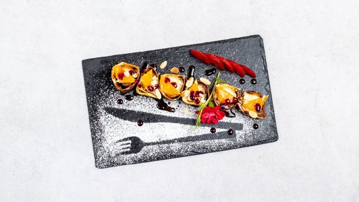Banan w chrupiącej tempurze zawinięty w omlet tamago z Nutellą i serkiem Philadelphia. Podawany w towarzystwie autorskiego sosu i owoców