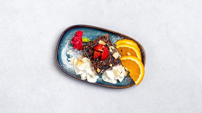 Puszyste ciasto czekoladowe podawane na ciepło w towarzystwie autorskiego sosu, prażonych migdałów i owoców