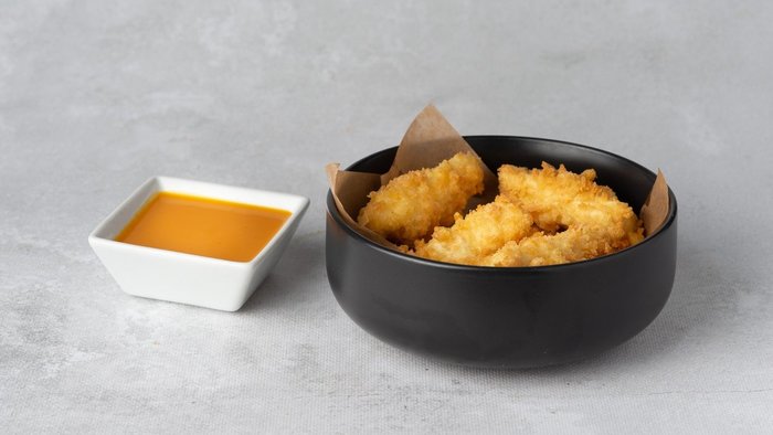 4 szt. Chrupiące paluszki tofu w tempurze podawanych z sosem sweet chilli. Zdjęcie poglądowe