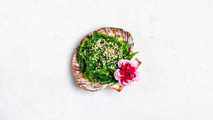 100 g sałatki goma wakame podawanej z prażonym sezamem