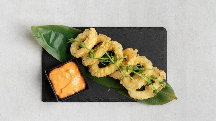 4 szt. Kalmary w chrupiącej tempurze podawane z sosem sweet chilli. Zdjęcie poglądowe